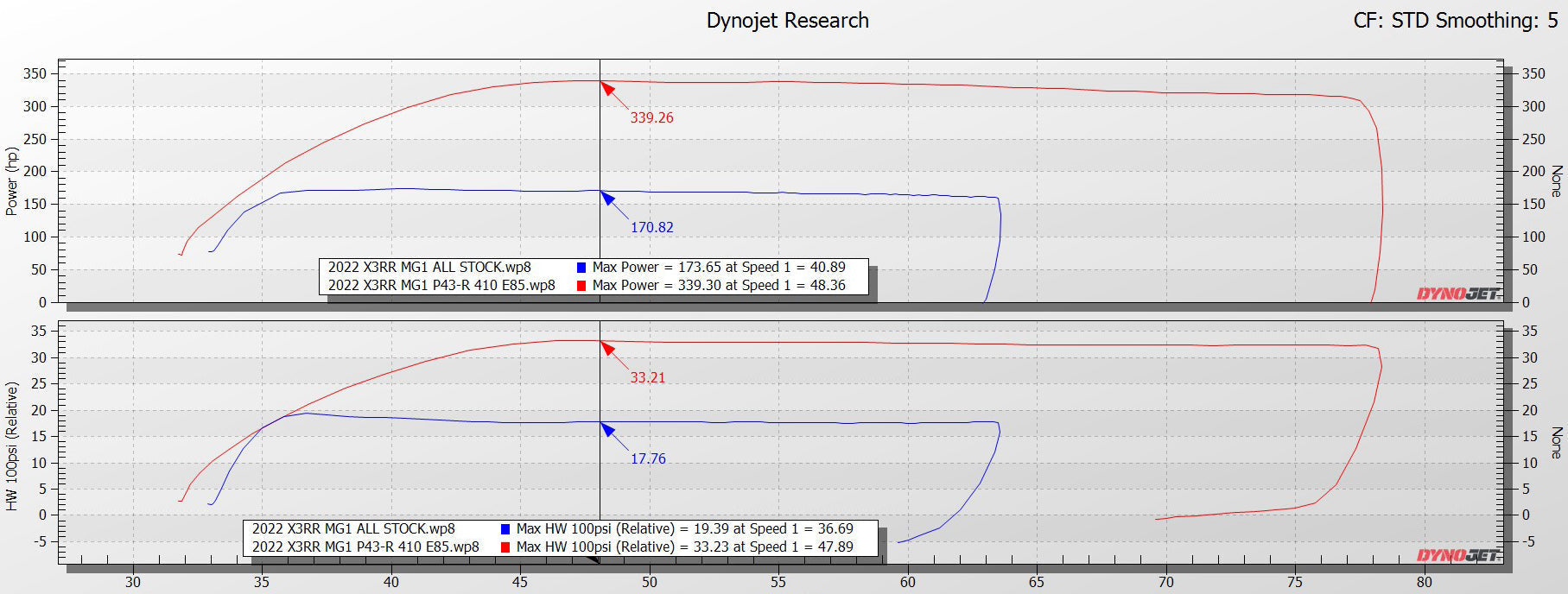 Amazing spool characteristics coupled with the power and flow rate of a much larger turbo leave plenty of overhead performance left to combat altitude changes affecting boost pressure while also allowing your power level to increase as we continue to develop upgraded packages. Achieving 415 crank horsepower at only 34 lbs of boost is a testament to the function of the EVP tuning combined with the instantaneous spool characteristics of the P43R and EVP engine package components. Add the amazing torque management and on-demand power delivery of the potent MG1 ECU, and the total package turns your X3 RR into a supercharged muscle car with power that never fades.