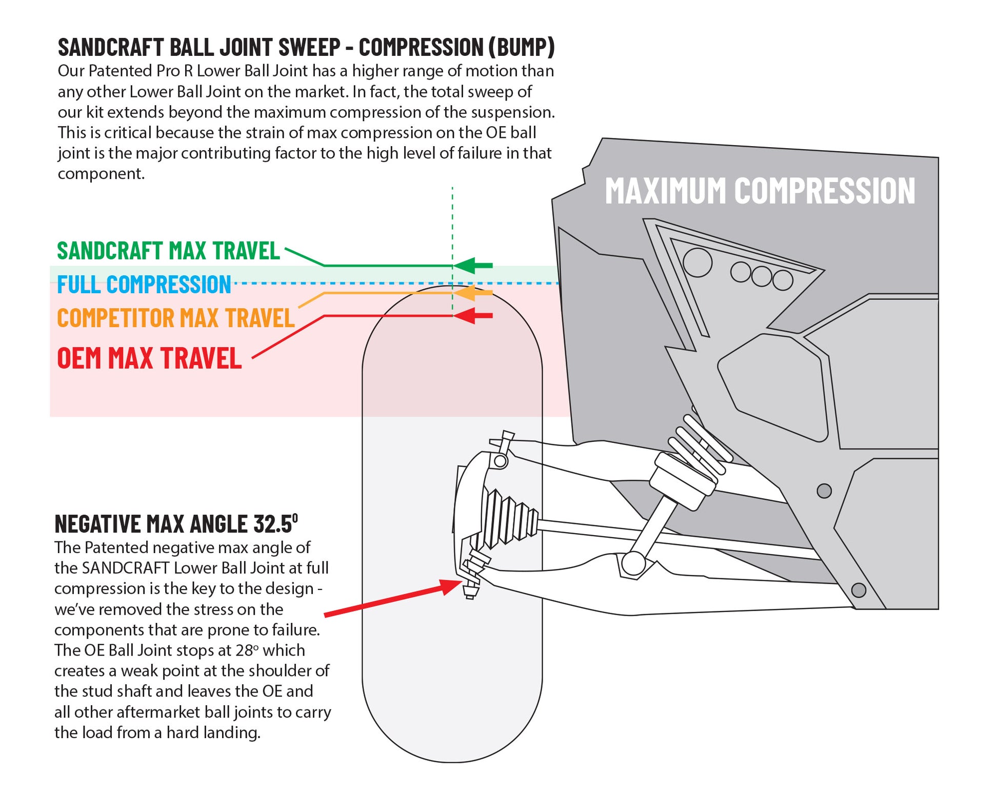 SANDCRAFT has solved the PRO-R/TURBO-R Lower Ball Joint issue. This product was designed to maximize performance and reliability to levels not seen anywhere else on the market. Every component has been re-engineered and machined in house. We use the best hardened steel components that will keep up with even the most extreme driving conditions. The SANDCRAFT kit has 14.8% more operating angle and features a stud that is 28% thicker at the threads than OEM.