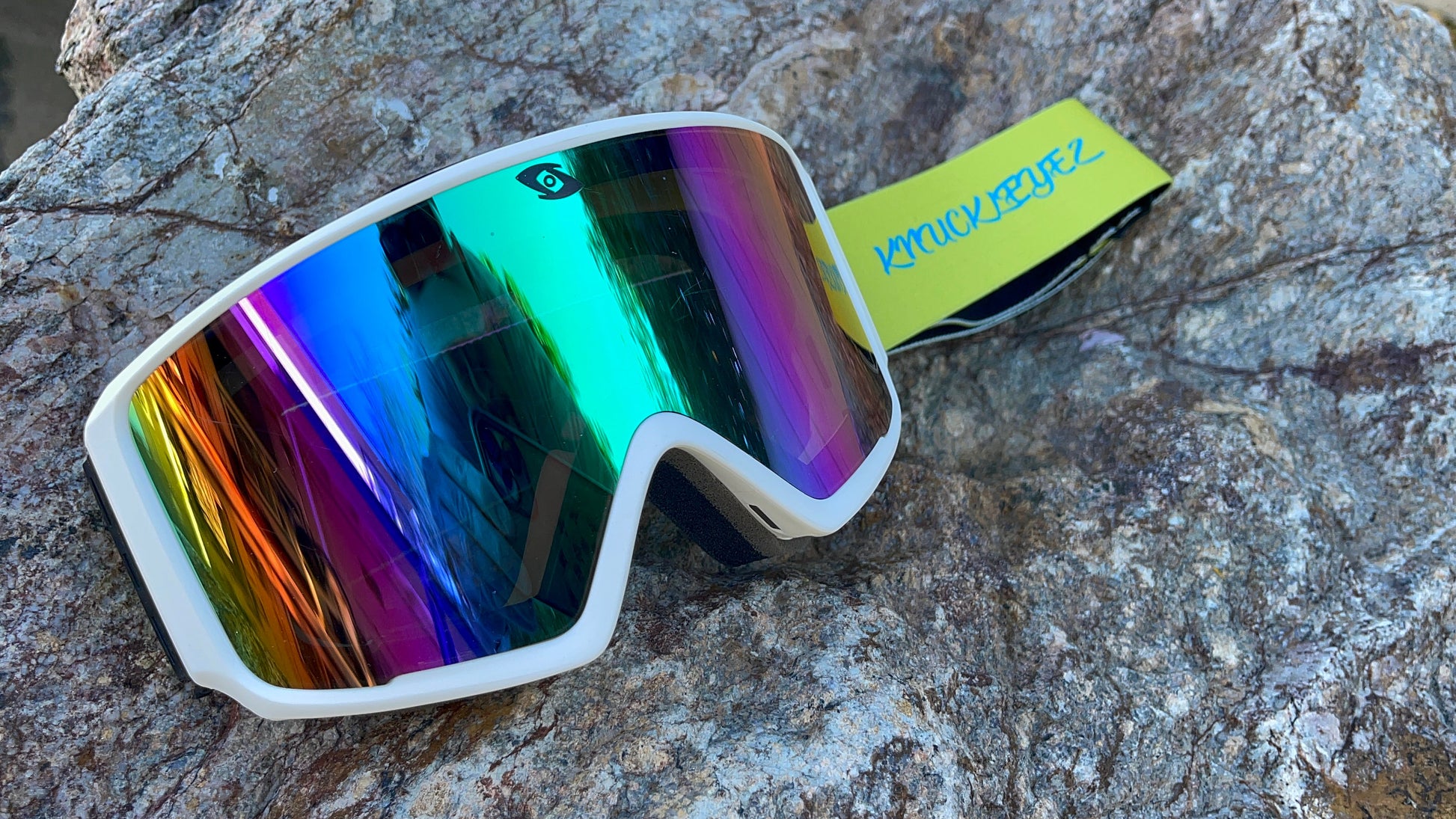 KnucKL-EyeZ Multi-Sport Goggles with White Frame and Neon Green Strap.